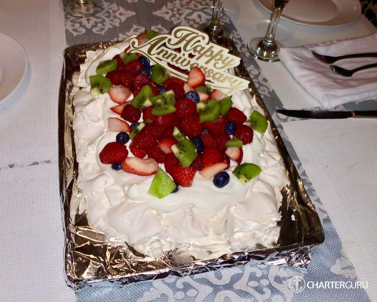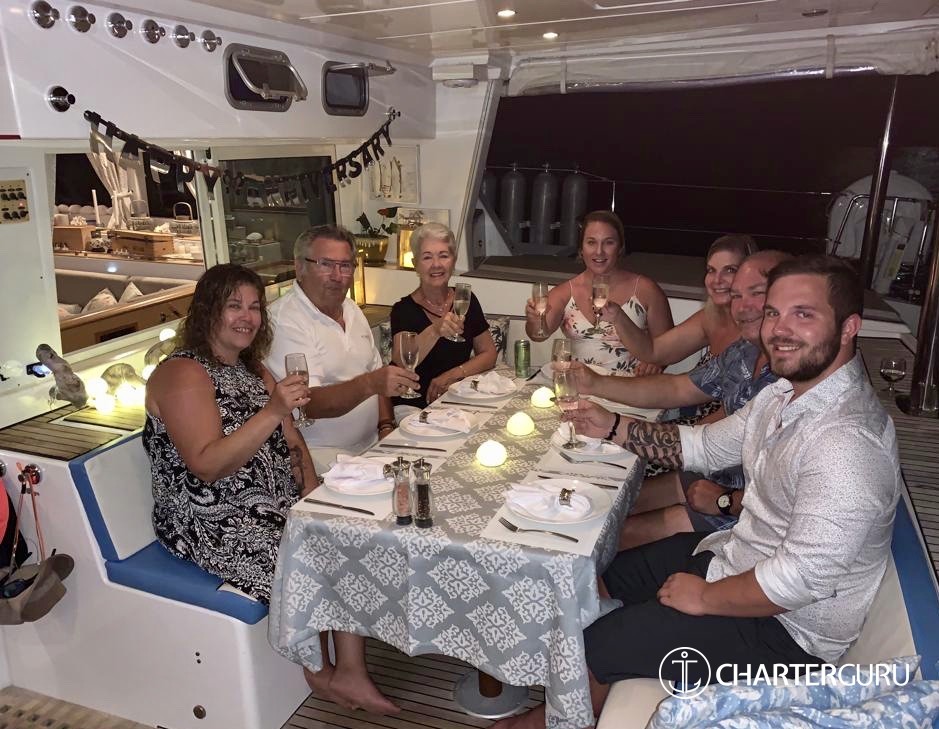 Thank you for making our 50th Wedding Anniversary so amazing! Katlyn is such a special boat and we will always remember our time with you. From quiet times to sundowners and Val’s amazing meals – all I can say is WOW! We loved watching your teamwork, Captain Doug and Val’s skills at guiding us to a buoy. Please come to south Carolina – free golf! ~ Ray and Pam